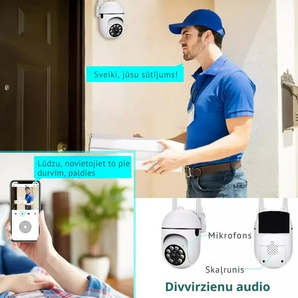 Stebėjimo kameroje įmontuotas jautrus mikrofonas, kurio dėka galite klausytis ir kalbėtis naudojantis mūsų programėle. Dvipusis garsas leidžia bendrauti su laukiamais draugais, o judesio aptikimo signalizacija padeda atsikratyti nepageidaujamų svečių ar gyvūnų.