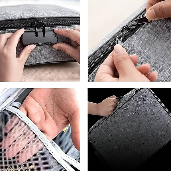 Nerimaujate dėl savo svarbių dokumentų ir vertybių saugumo? Šiame vandeniui atspariame krepšyje įrengta saugi kodinė spyna, užtikrinanti, kad jūsų dokumentai, pinigai ir papuošalai liks neprieinami kitiems asmenims.