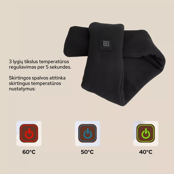 Įjunkite šaliką į nešiojamąjį įkroviklį ir paspauskite mygtuką – šildymas prasidės iš karto. Lengvai reguliuokite temperatūrą pagal savo poreikius naudodami 3 pakopų reguliatorių.