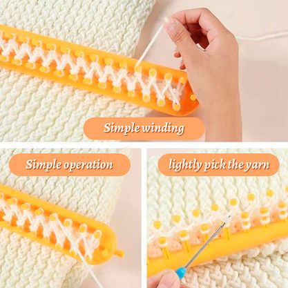 4x skirtingų dydžių mezgimo įrankiai, 1x kabliukas baigtam gaminiui nuimti, 2x adatos, 1x instrukcija. - Medžiaga: