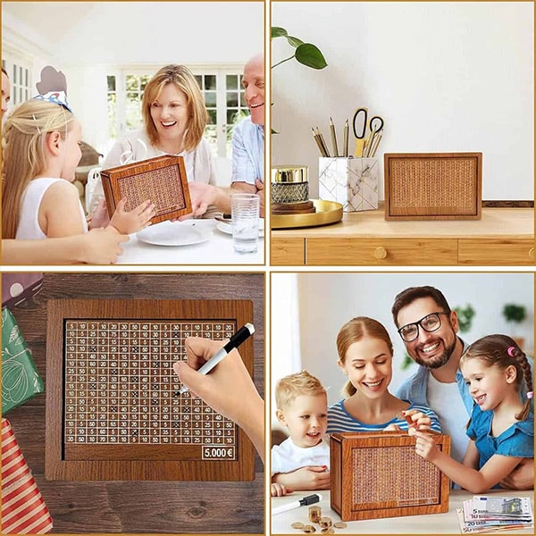 Įdiekite savo COINSAVE taupyklę per kelias minutes! Pridedamas žymeklis ir taupymo lapeliai leidžia lengvai personalizuoti. Tai elegantiškas dizainas, kuris puikiai dera jūsų namuose ar biure.