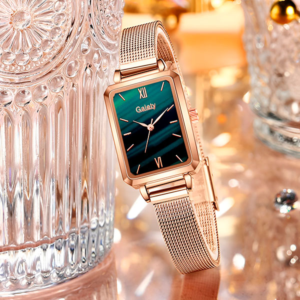 Šis laikrodis turi blizgią rožinio aukso spalvą ir gražų žalią ciferblatą. Jis suteikia stiliaus bet kokiai suknelei, džinsams ar oficialiai aprangai.