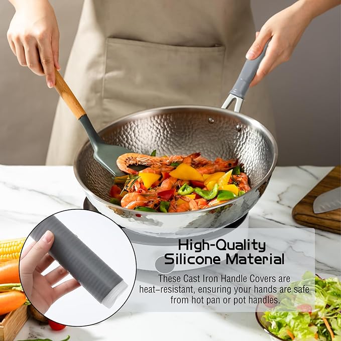 Mūsų silikoniniai užvalkalai sukurti taip, kad būtų suderinami su įvairių dydžių puodų ir keptuvių rankenomis, todėl jie yra universalūs ir pritaikomi virtuvės reikmenys, puikiai tinkantys ketaus keptuvėms ir plokščiadugnėms keptuvėms.