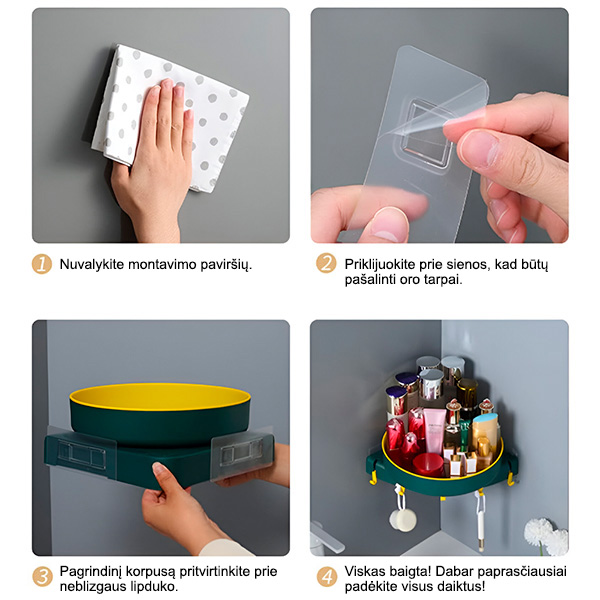 Nereikia gręžti! Stiprus lipnus pagrindas užtikrina, kad jis tvirtai laikysis vietoje ir nesugadins jūsų sienų. Tiesiog priklijuokite ir pradėkite tvarkytis!