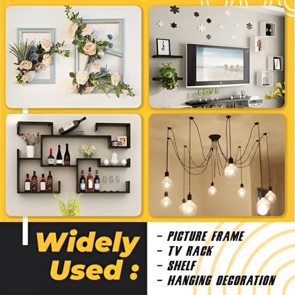 Puikiai tinka įvairiems namų interjero poreikiams: paveikslų rėmeliams, lempoms, užuolaidoms, laikrodžiams, augalams ir kitiems daiktams kabinti ant gipso kartono ar gipsinių plokščių.